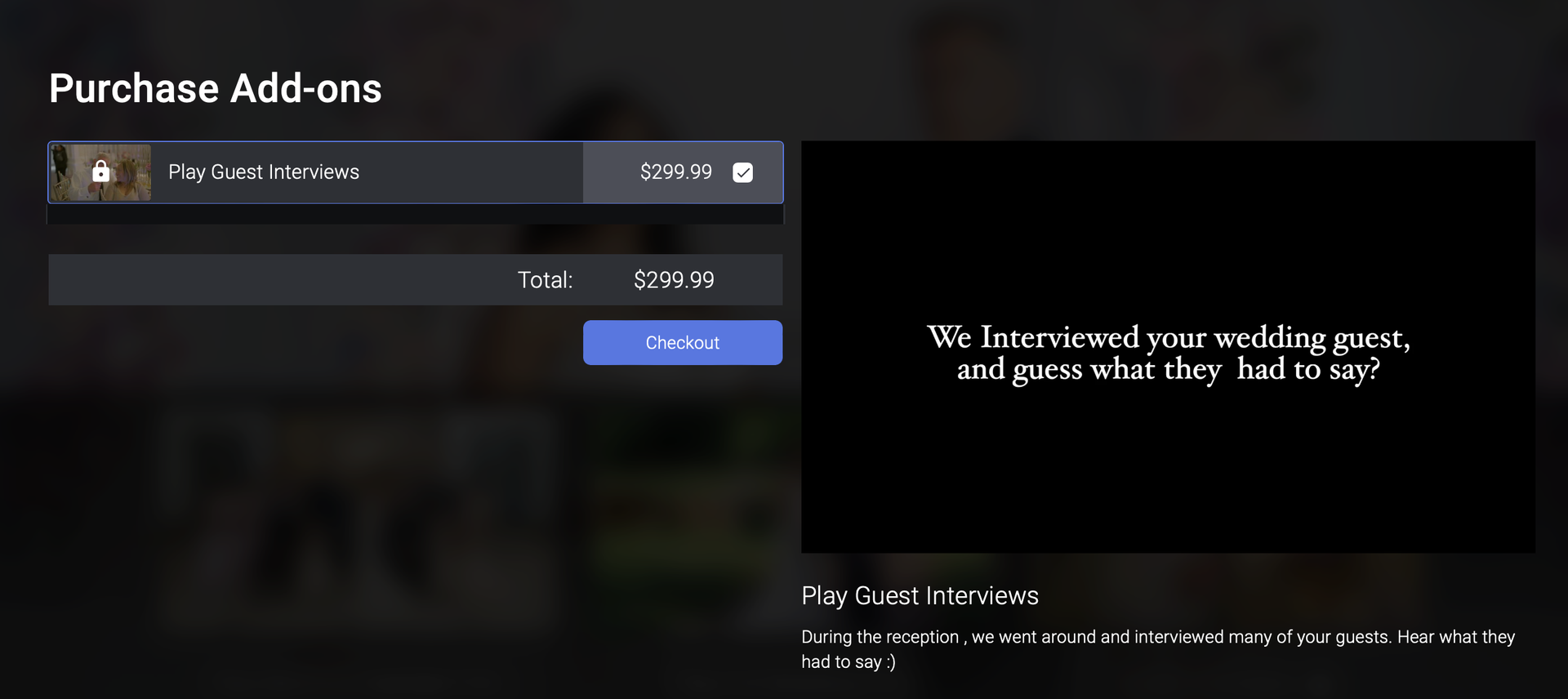 Dynamic Video Sales is an innovate marketing tool that enables you to seamlessly upsell customized add-ons with your delivered content, boosting both the emotional impact of your films and your revenue.